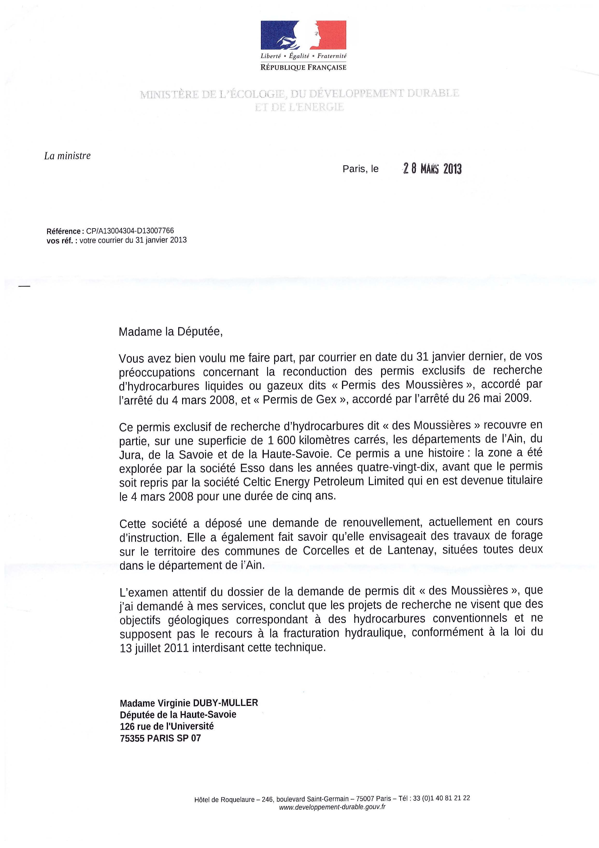 Réponse de Delphine BATHO sur les permis des Moussières et de Gex 2480 3509 Virginie DUBY-MULLER