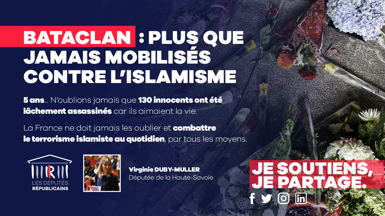 5 ans depuis cette nuit de l’horreur où 130 personnes ont été tuées parce qu’elles aimaient la vie. Malheureusement, d’autres attentats ont suivi. La lutte contre le terrorisme islamiste doit se poursuivre. #13Novembre2015 1280 720 Virginie DUBY-MULLER